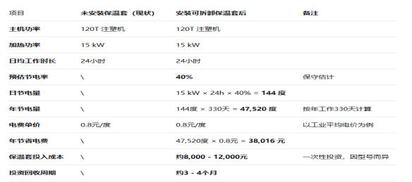 讓我們通過一個(gè)簡(jiǎn)單的例子來算一筆賬:某 120T 注塑機(jī),加熱功率 15kW,日均工作 24 小時(shí)。未安裝保溫套時(shí)無節(jié)電效果,安裝可拆卸保溫套后預(yù)估節(jié)電率 40%,日節(jié)電量 144 度,年節(jié)電量 47520 度,年節(jié)省電費(fèi) 38016 元;保溫套投入成本約 8000-12000 元,投資回收周期約 3-4 個(gè)月。
